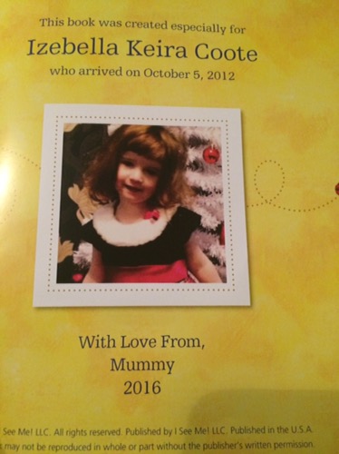 The book came with a big sheet of personalised stickers too, many for Izebella and one for every person in the book who loves her. She enjoyed sticking these on us all.